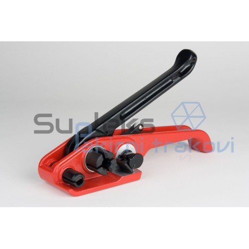 Enostaven za uporabo:  Trak najprej napnemo z ročico in ga nato ga s stiskom le-te odrežemo.